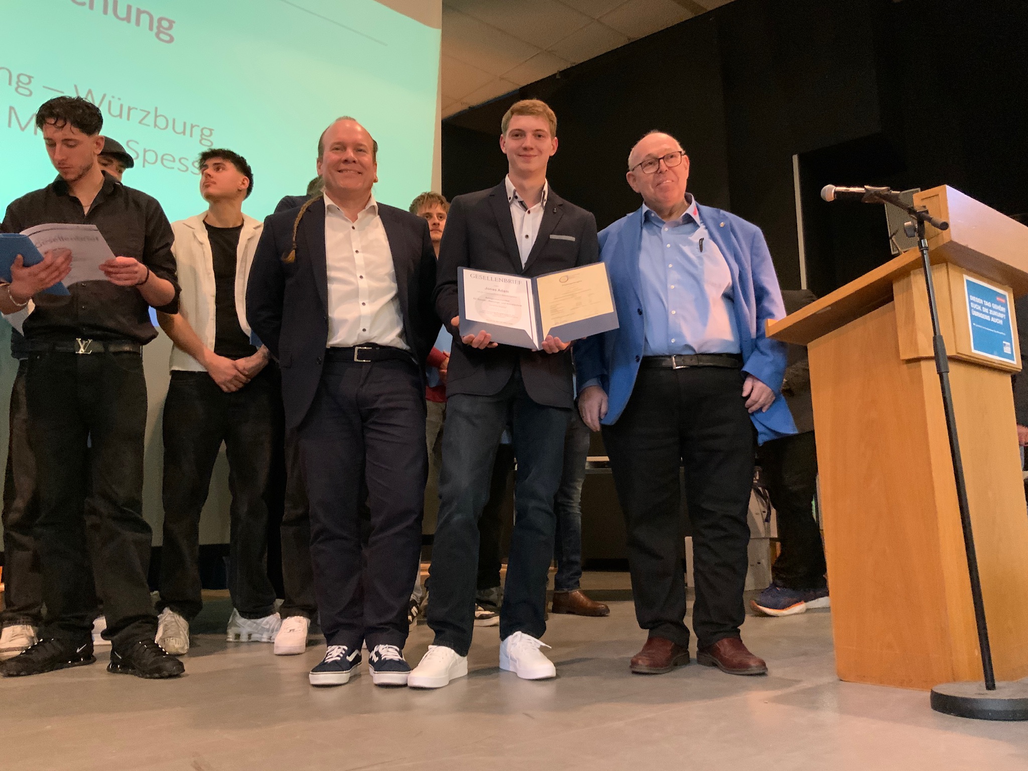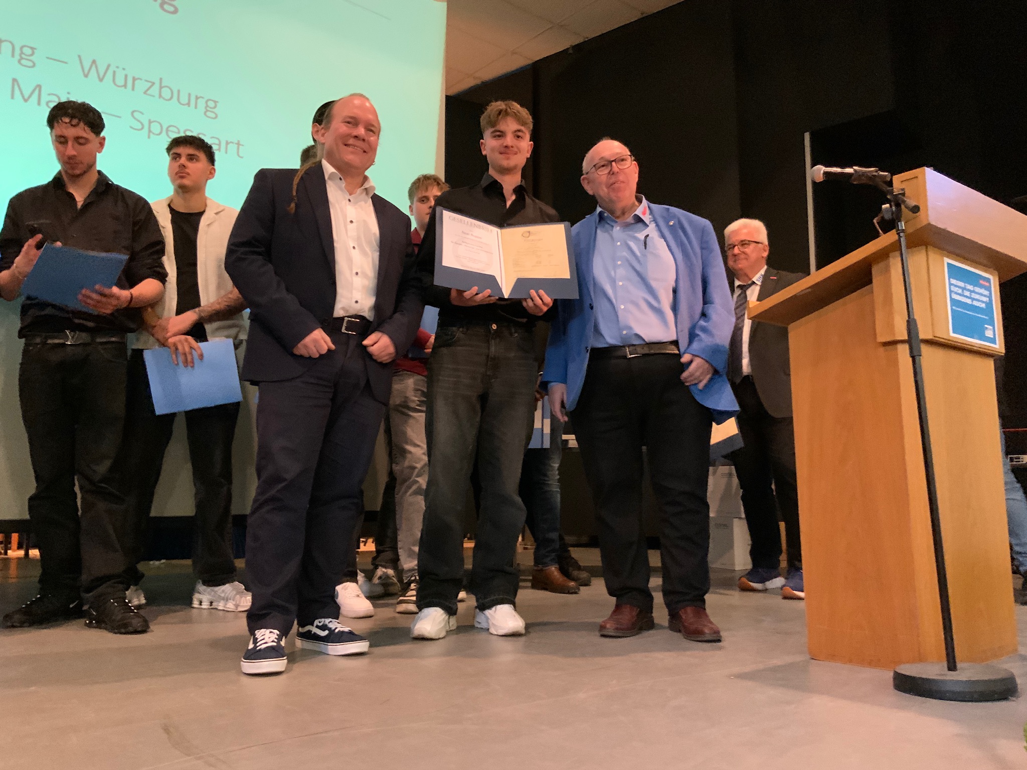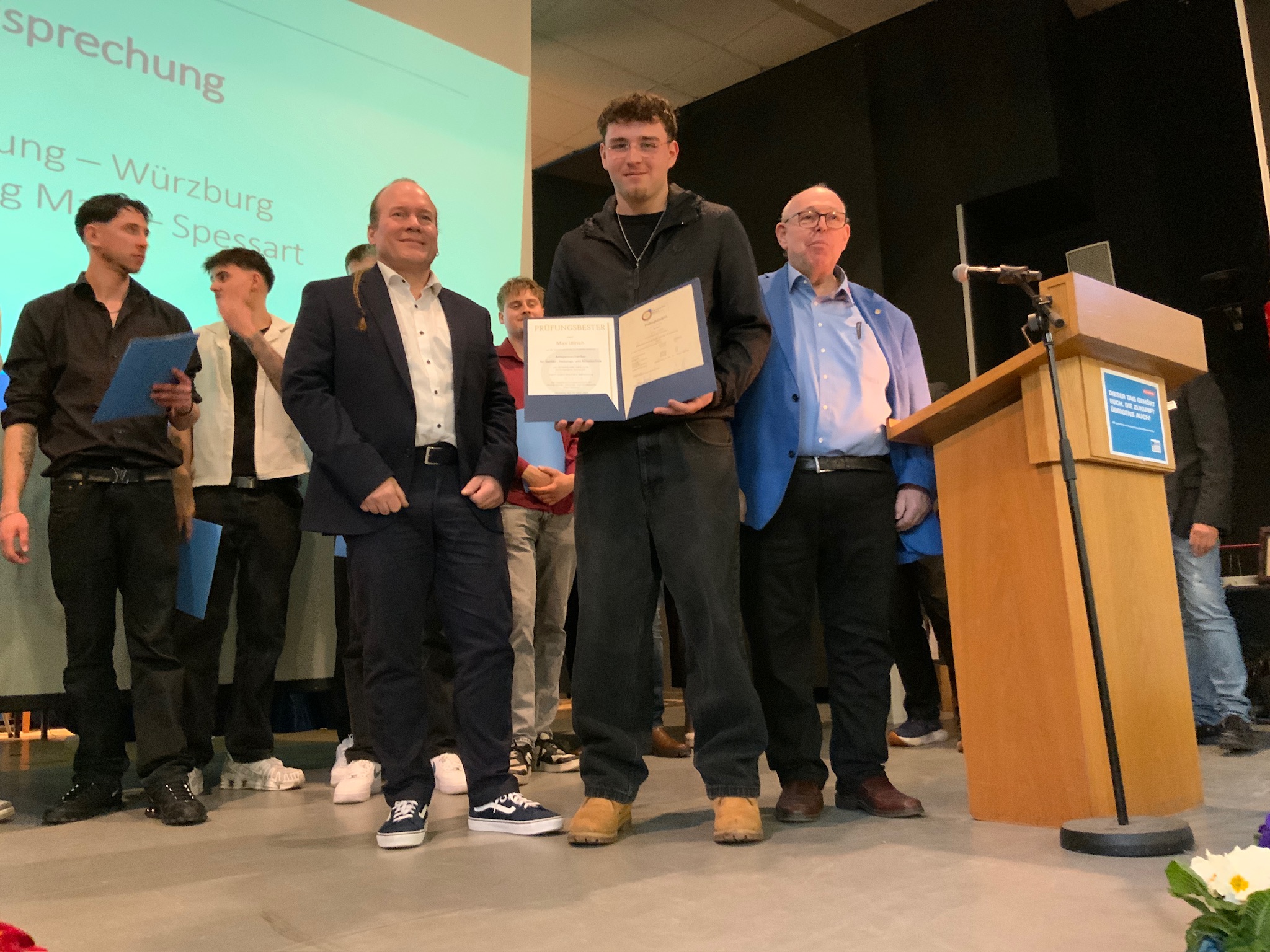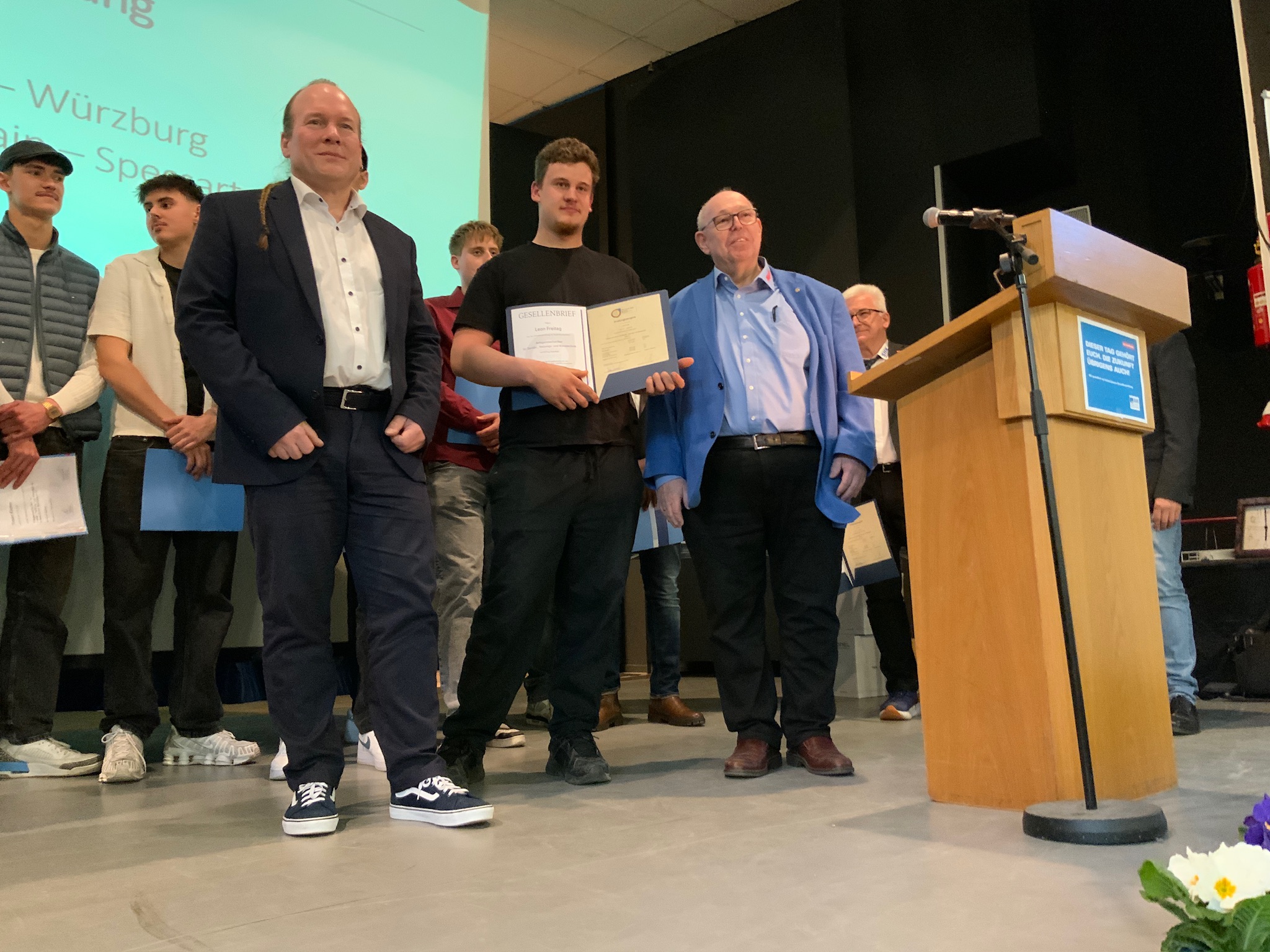 Die Freisprechung von Handwerksgesellen gleicht fast einer Bescherung zu Weihnachten: Die Spannung steigt bis zur Übergabe der Gesellenbriefe ins Unermessliche und fällt erst, wenn der Junghandwerker seinen Leistungsnachweis in den Händen hält. So geschehen am Freitagnachmittag (13.03.26) als die Obermeister Werner Rath (Innung Würzburg) und Johannes Reber (Innung Main-Spessart) im Radlersaal die lang erwarteten Gesellenbriefe an 29 Junghandwerker aus Würzburg und 13 aus Main-Spessart überreichten.